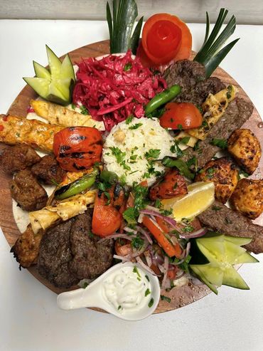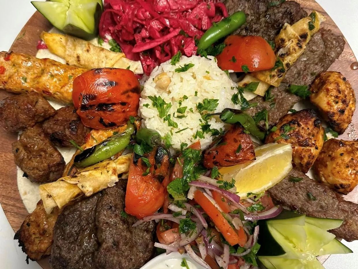 Adana kebab, chicken Adana kebab,3 pieces beef shish, 3 pieces chicken shish,4 pieces kofte kebab, served with onion salad, red cabbage, rice.