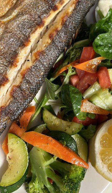 Salmon fillet marinated in Turkish style, served with mash potato, mix veggies.
