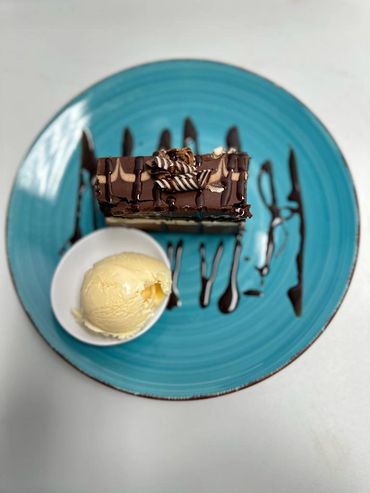 Light, creamy chocolate mousse cake, served with ice cream walnuts